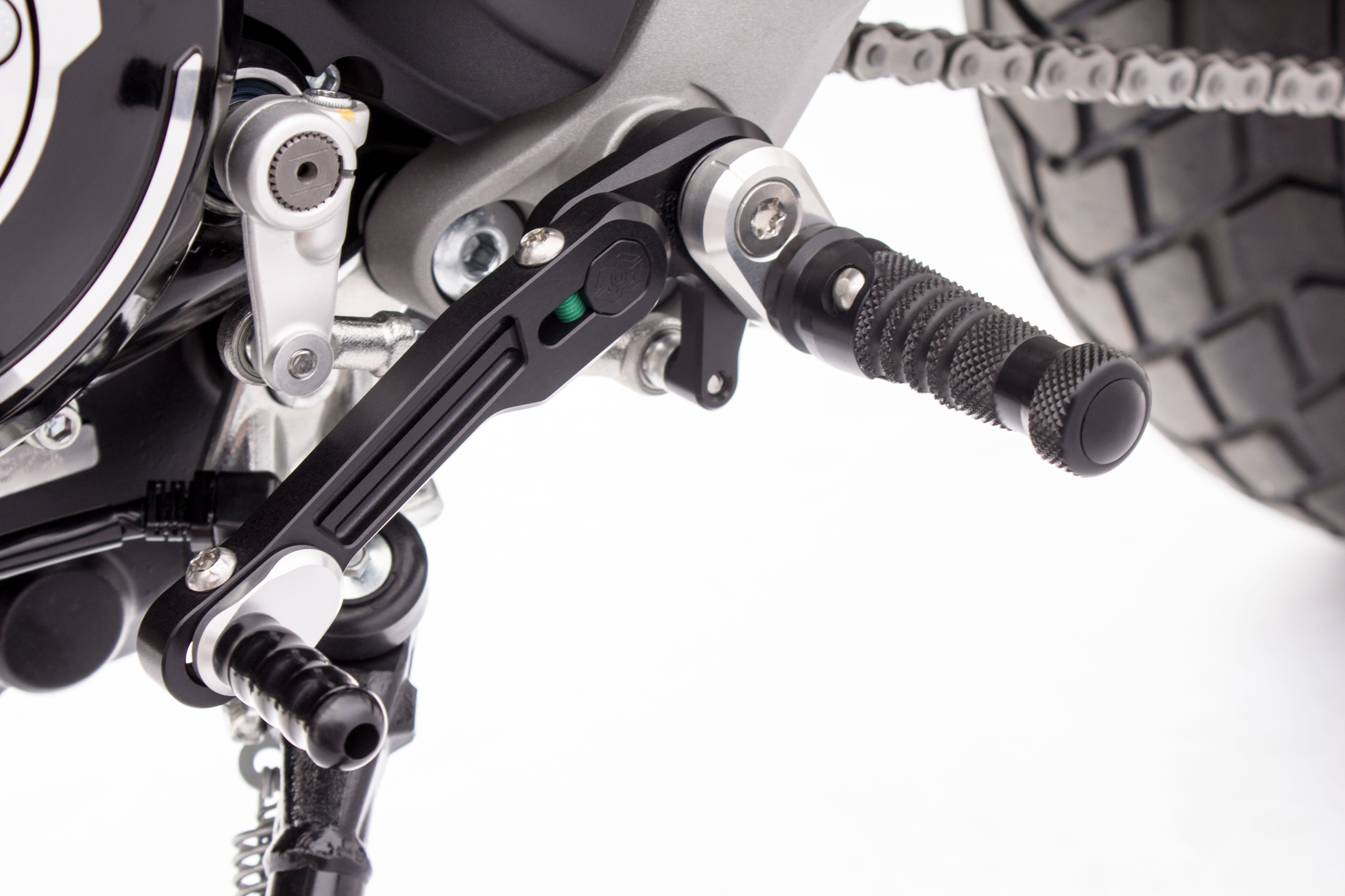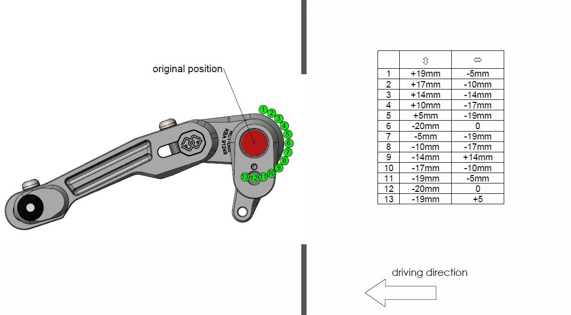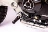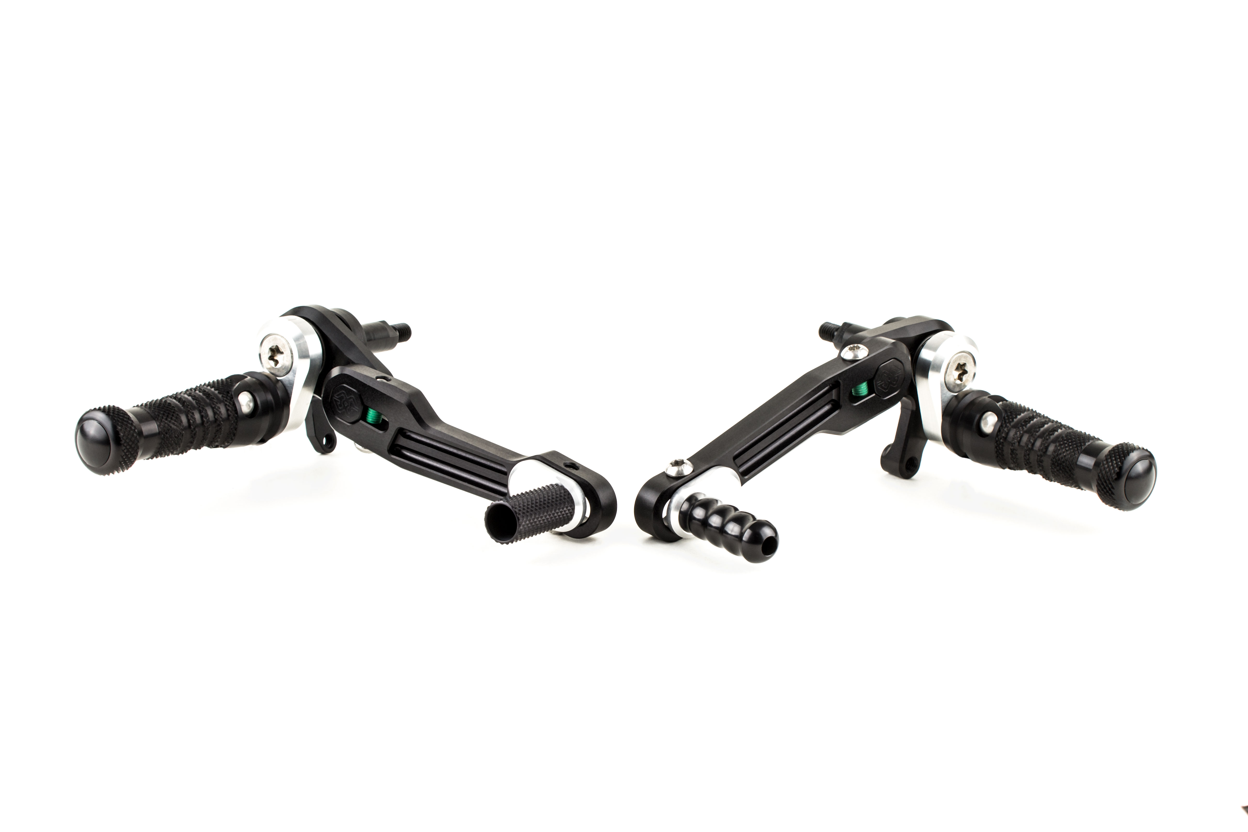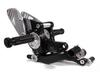 Consentono, tramite un eccentrico, di scegliere tra 12 posizioni per il poggiapiedi, e sono dotate di leve freno e cambio montate su cuscinetti e di puntalini leve regolabili. Il kit pedane viene fornito in diverse finiture ottenute attraverso una anodizzazione dura che protegge le parti dall’usura.