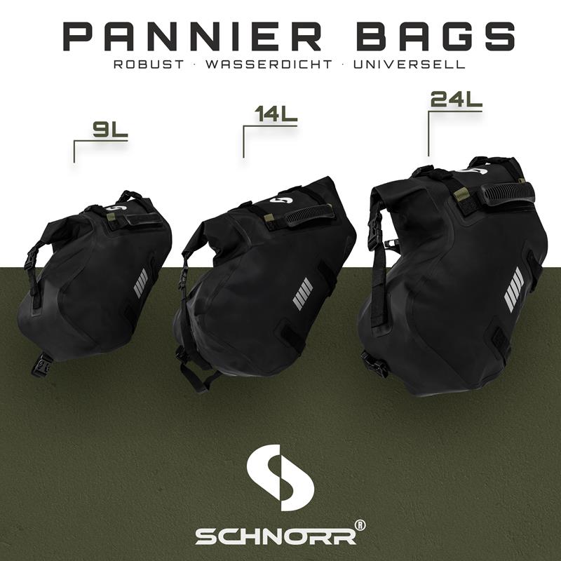 Note: Borse laterali SCHNORR 9L - Set di 2 (totale 18L) - borse da moto compatte e impermeabili realizzate in vinile 500D per esterni.